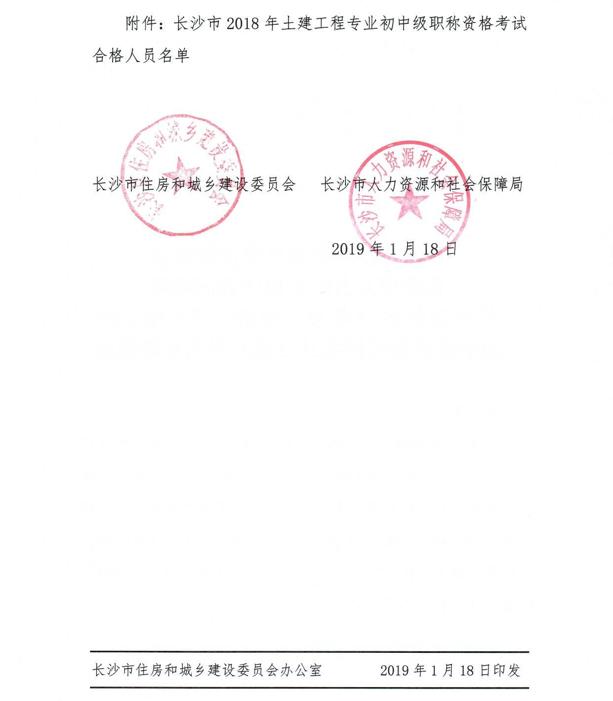 關(guān)于公布2018年度長沙市土建工程專業(yè)初中級職稱資格考試合格人員名單的通知
