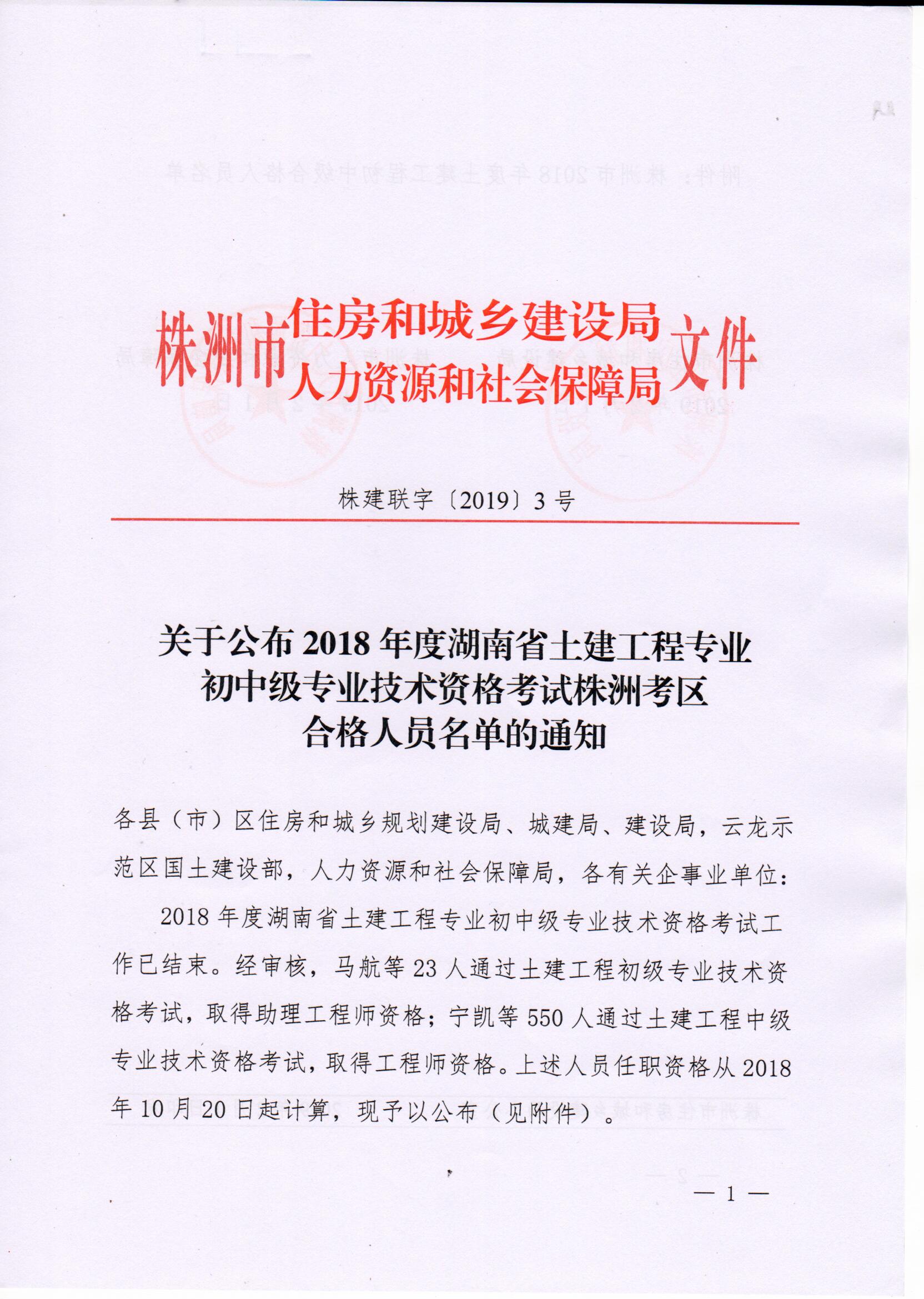 關(guān)于公布2018年度株洲市土建工程專業(yè)初中級專業(yè)技術(shù)資格考試合格人員名單的通知