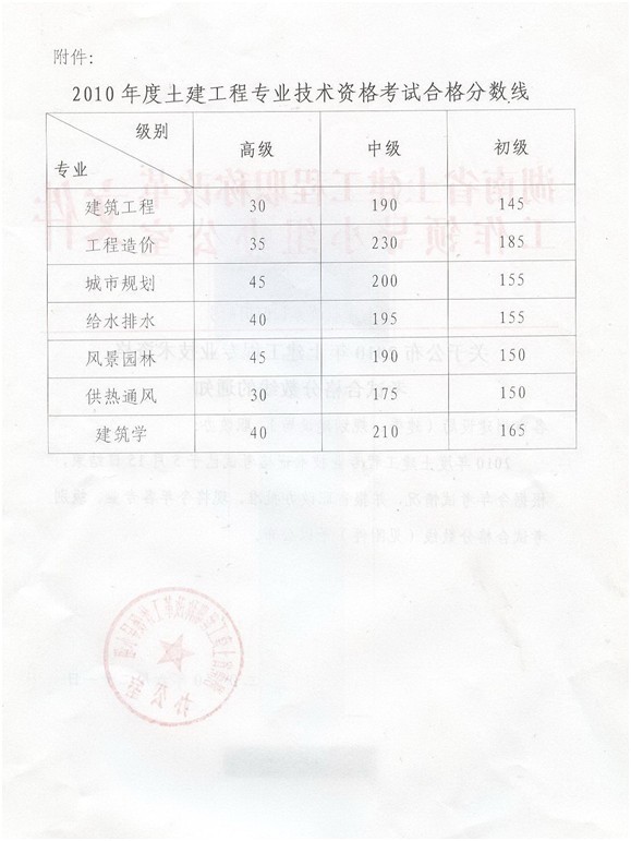 關(guān)于公布2010年湖南省土建工程專業(yè)考試合格分?jǐn)?shù)線的通知