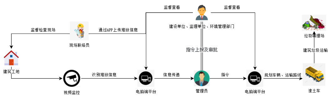 建立現(xiàn)場建筑垃圾堆放可視化平臺,在各個建筑垃圾堆放點設(shè)置視頻監(jiān)控設(shè)施,并與協(xié)同管理平臺進(jìn)行互聯(lián),對建筑垃圾的堆放種類、堆放量進(jìn)行24h監(jiān)控,為環(huán)境管理部門監(jiān)督提供便利,也可防止建筑垃圾在堆放過程中發(fā)生火災(zāi)及其他混亂情況。