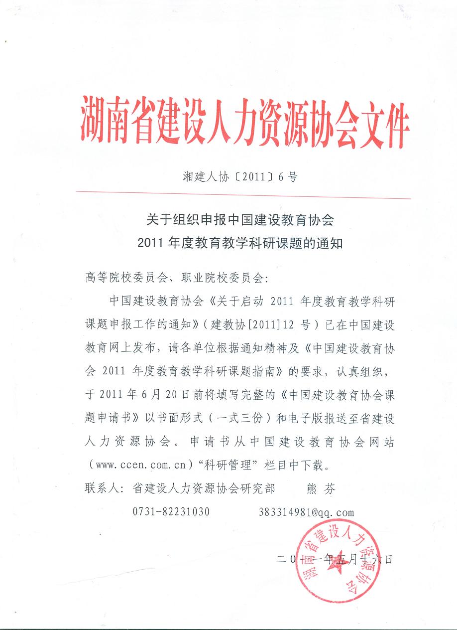 中國建設教育協(xié)會《關于啟動2011年度教育教學科研課題申報工作的通知》(建教協(xié)[2011]12號)已在中國建設教育網上發(fā)布,請各單位根據(jù)通知精神及《中國建設教育協(xié)會2011年度教育教學科研課題指南》的要求,認真組織,于2011年6月20日前將填寫完整的《中國建設教育協(xié)會課題申請書》以書面形式(一式三份)和電子版報送至省建設人力資源協(xié)會。申請書從中國建設教育協(xié)會網站(www.ccen.com.cn)“科研管理”欄目中下載。