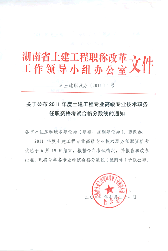 關于公布2011年度土建工程專業(yè)高級專業(yè)技術職務任職資格考試合格分數(shù)線的通知