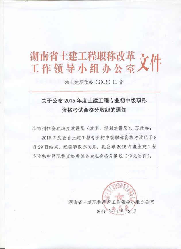 關(guān)于公布2015年土建工程專業(yè)初中級職稱