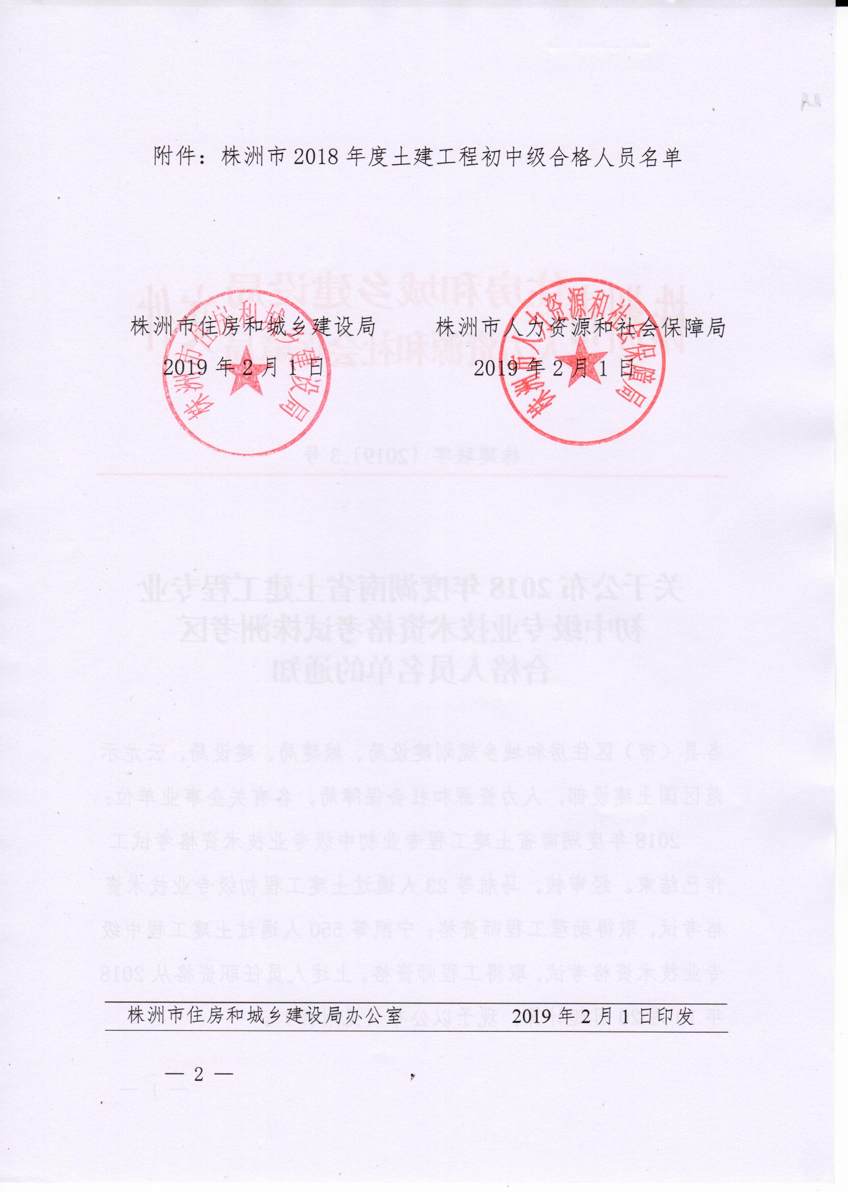 關(guān)于公布2018年度株洲市土建工程專業(yè)初中級專業(yè)技術(shù)資格考試合格人員名單的通知