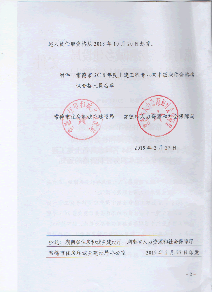 湖南省2018年度常德市土建工程專業(yè)初中級職稱資格考試合格人員名單