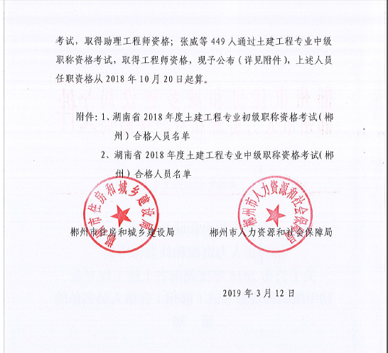 關(guān)于公布湖南省2018年度郴州市土建工程專業(yè)初中級職稱資格考試合格人員名單的通知