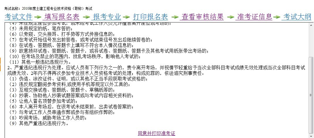 第四步:進(jìn)入相應(yīng)的考試操作界面,一般每次考試均有:考試文件、填寫報名表、報考專業(yè)、打印報名表、查看審核結(jié)果、準(zhǔn)考證信息、考試大綱等操作提示。點(diǎn)擊“準(zhǔn)考證信息”,瀏覽考試注意事項(xiàng),再選擇屏幕下方的”同意并打印準(zhǔn)考證“,即可打印。如圖: