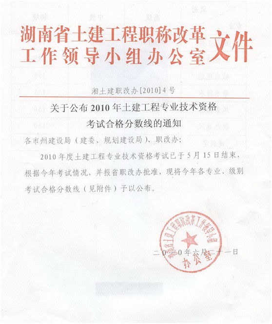 關(guān)于公布2010年湖南省土建工程專業(yè)考試合格分?jǐn)?shù)線的通知