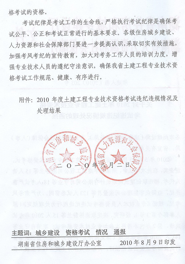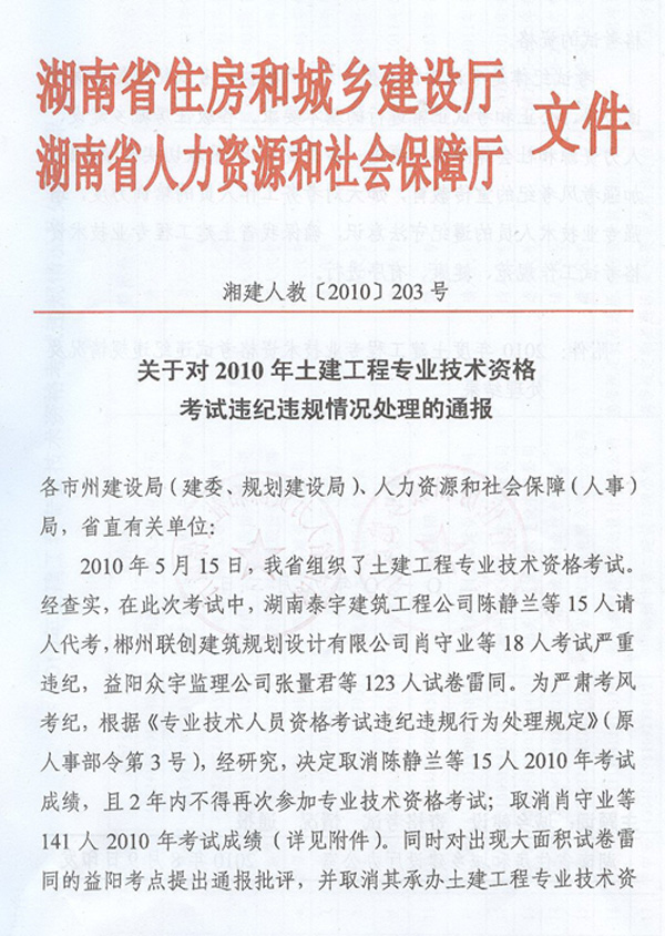 關(guān)于對2010年土建工程專業(yè)技術(shù)資格考試違紀(jì)違規(guī)情況處理的通知
