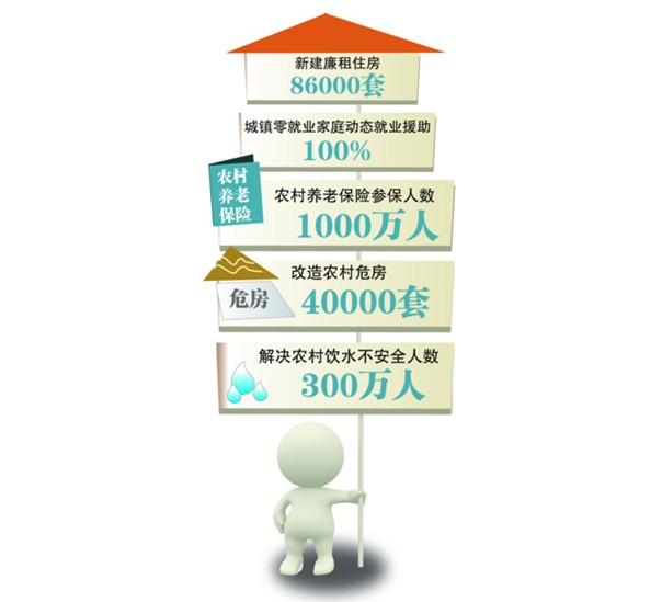 除繼續(xù)實施農(nóng)村公路、農(nóng)村飲水安全、義務教育學校改造、農(nóng)村勞動力轉移就業(yè)、敬老院等20多個傳統(tǒng)項目之外,新建廉租房、兒童先天性心臟病免費治療、農(nóng)村清潔示范工程、國有林場、危房改造等新項目被納入今年的“八件實事”范疇。與往年相比,今年公布的建議指標,更加突出解決民眾最關心最迫切的民生問題。從公布的為民辦實事建議指標來看,今年各項指標的數(shù)量也在不斷擴大,其中,解決農(nóng)村飲水不安全人數(shù)要達到300萬人,比去年增加100萬人;改造農(nóng)村危房40000套,農(nóng)村養(yǎng)老保險參保人數(shù)1000萬人,城鎮(zhèn)零就業(yè)家庭動態(tài)就業(yè)援助達到100%,新建廉租住房86000套。